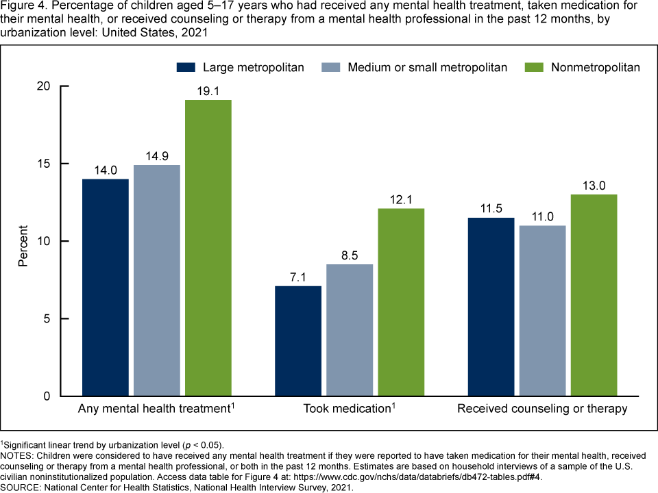 - In 2021, the percentage of children who had received any mental health treatment in the past 12 months increased as the place of residence became more rural, from 14.0% in large metropolitan areas to 14.9% in medium or small metropolitan areas and 19.1% in nonmetropolitan areas (Figure 4).