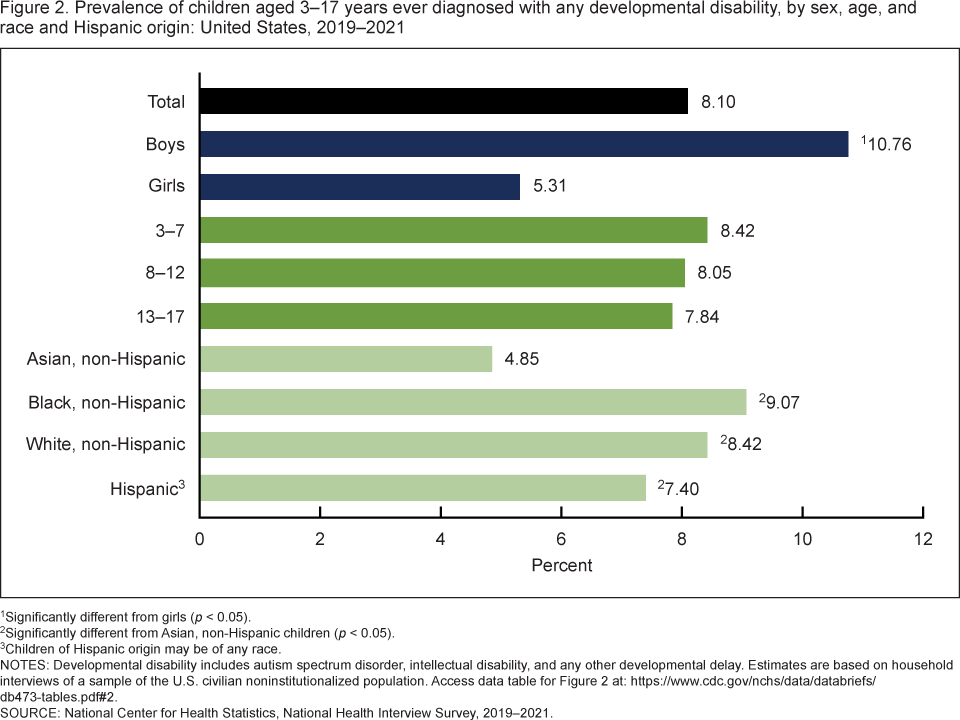 Zablotsky B, Ng AE, Black LI, Blumberg SJ. Diagnosed developmental disabilities in children aged 3–17 years: United States, 2019–2021. NCHS Data Brief, no 473. Hyattsville, MD: National Center for Health Statistics. 2023. DOI: https://dx.doi.org/10.15620/cdc:129520.