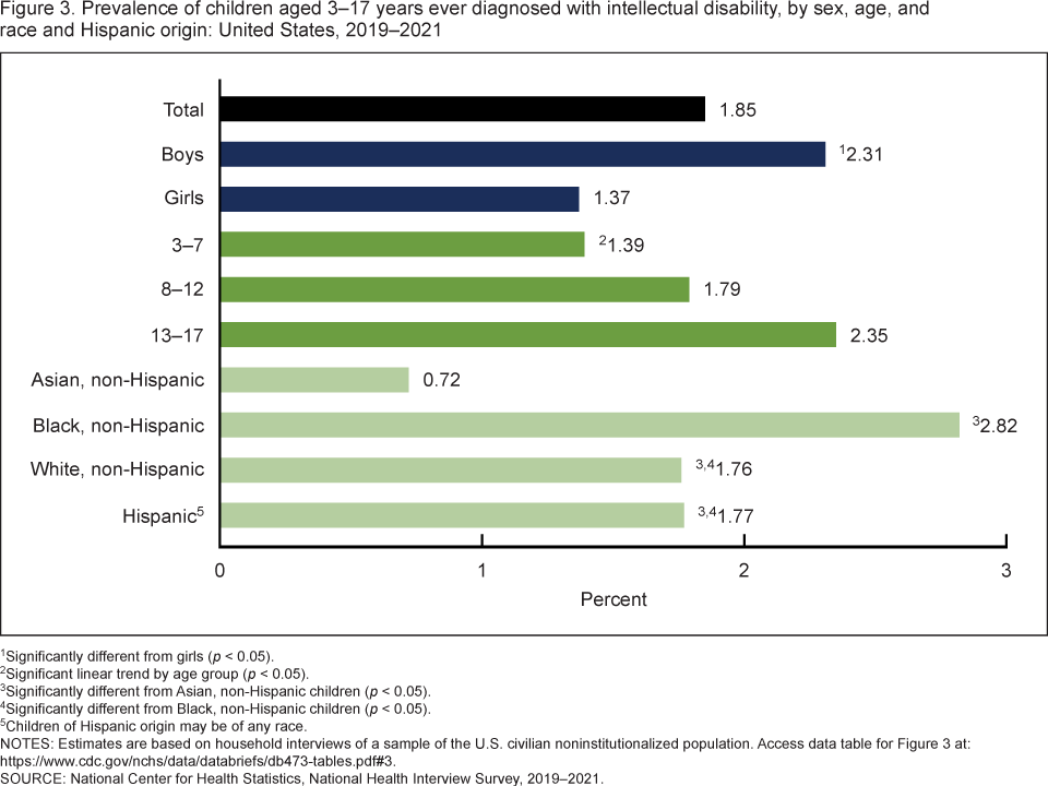 Figure 3. Prevalence of children aged 3–17 years ever diagnosed with intellectual disability, by sex, age, and race and Hispanic origin: United States, 2019–2021