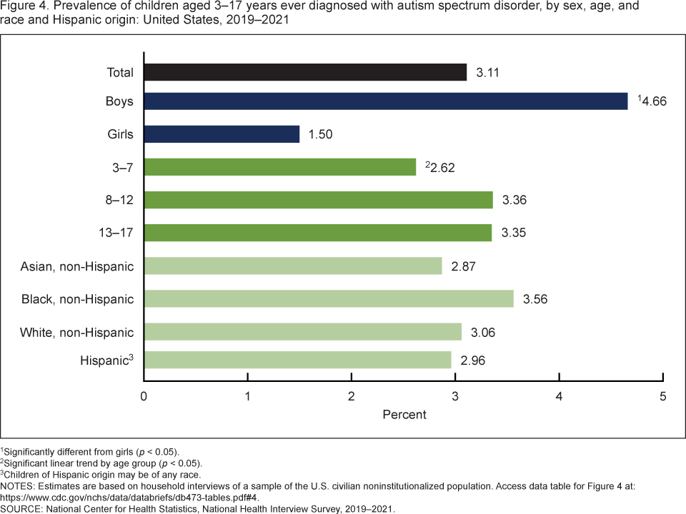 Figure 4. Prevalence of children aged 3–17 years ever diagnosed with autism spectrum disorder, by sex, age, and race and Hispanic origin: United States, 2019–2021