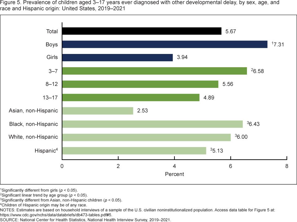 - The prevalence of developmental delay other than autism spectrum disorder or intellectual disability varied by sex, age group, and race and Hispanic origin.
