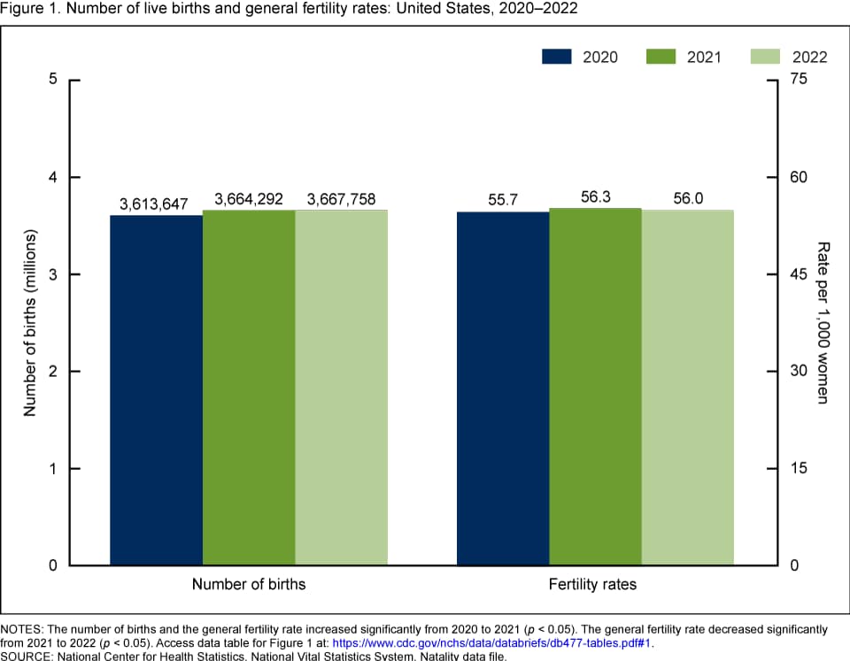 - The number of births in the United States was essentially unchanged from 2021 to 2022, following a rise of 1% from 2020 to 2021.