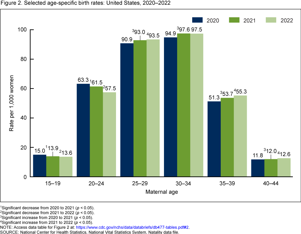 - The birth rate for women aged 40–44 rose 5% in 2022 from 12.0 to 12.6; the rate had risen 2% from 2020 to 2021.