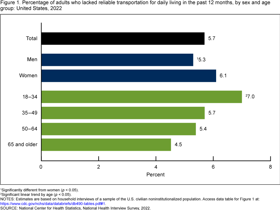 - In 2022, 5.7% of adults lacked reliable transportation for daily living in the past 12 months. Women (6.1%) were more likely than men (5.3%) to lack reliable transportation.