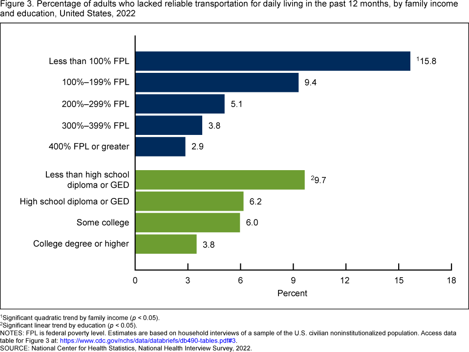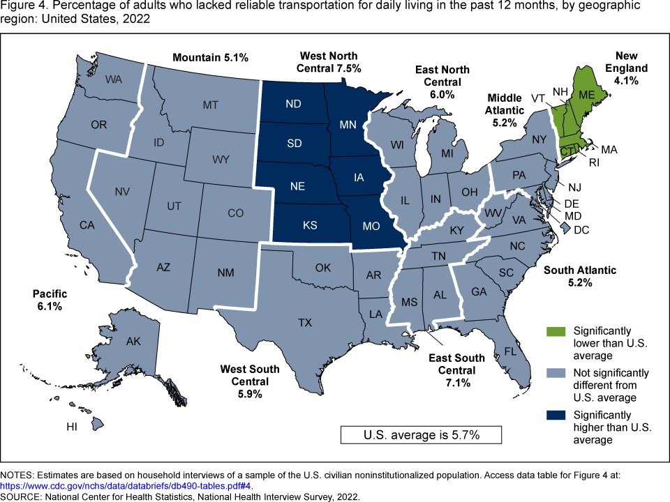 Ng AE, Adjaye-Gbewonyo D, Dahlhamer J. Lack of reliable transportation for daily living among adults: United States, 2022. NCHS Data Brief, no 490. Hyattsville, MD: National Center for Health Statistics. 2024. DOI: https://dx.doi.org/10.15620/cdc:135611