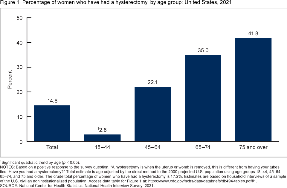 Gorina Y, Elgaddal N, Weeks JD. Hysterectomy among women age 18 and older: United States, 2021. NCHS Data Brief, no 494. Hyattsville, MD: National Center for Health Statistics. 2024. DOI: https://dx.doi.org/10.15620/cdc:145592.