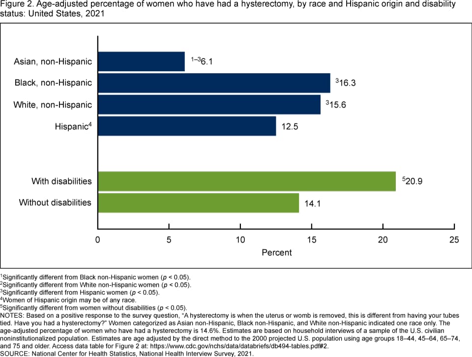Figure 2. Age-adjusted percentage of women who have had a hysterectomy, by race and Hispanic origin and disability status: United States, 2021