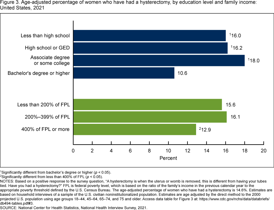 - Women with a family income of 400% or more of the federal poverty level (12.9%) were less likely to have had a hysterectomy compared with those with a family income of 200% to 399% of the federal poverty level (16.1%) and those with a family income of less than 200% of the federal poverty level (15.6%).