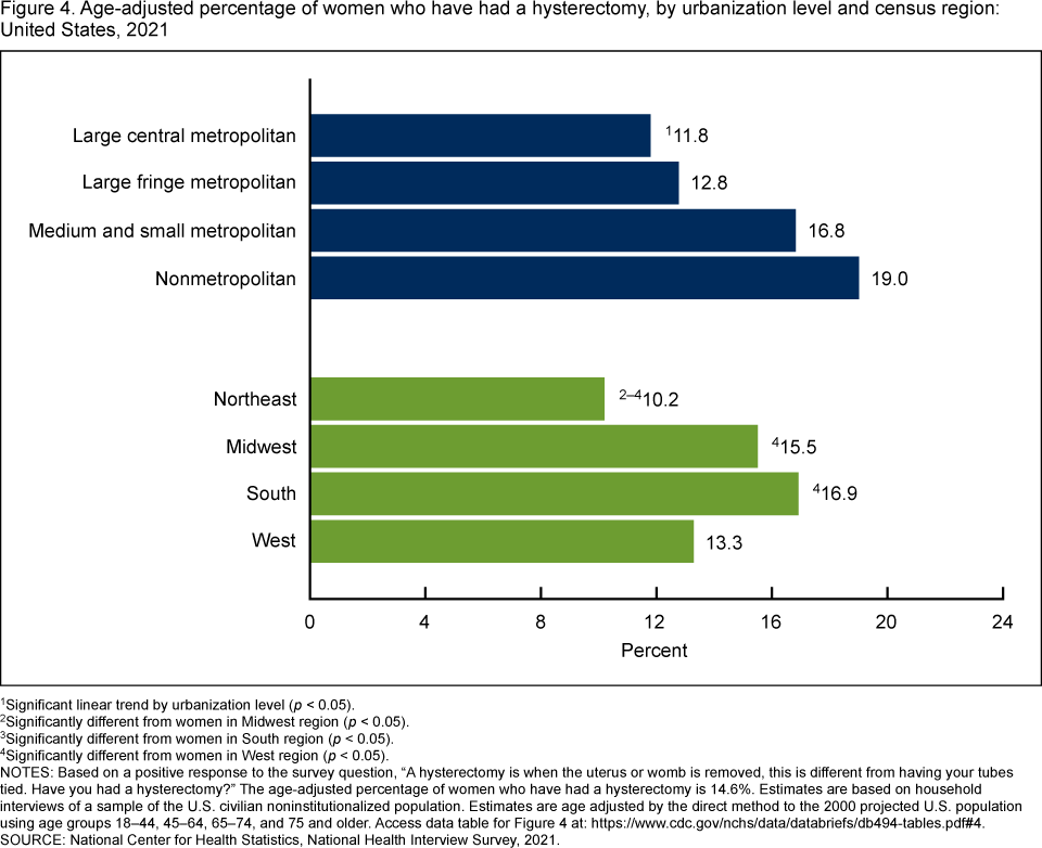 - Women living in the Midwest and South regions (15.5% and 16.9%, respectively) were more likely to have had a hysterectomy compared with those living in the West (13.3%) and Northeast (10.2%) regions.