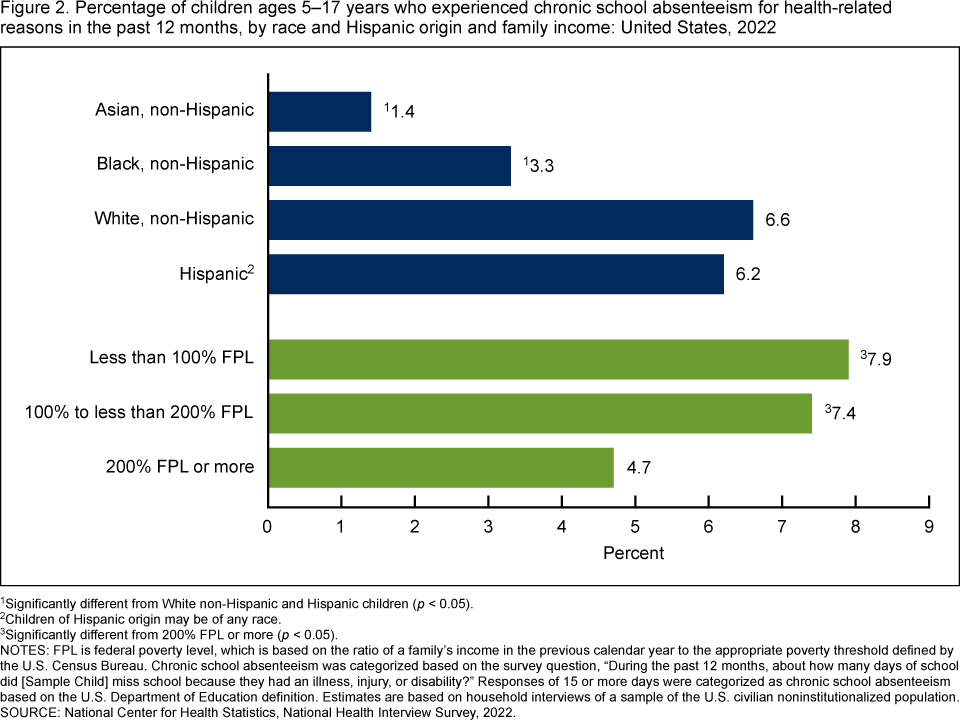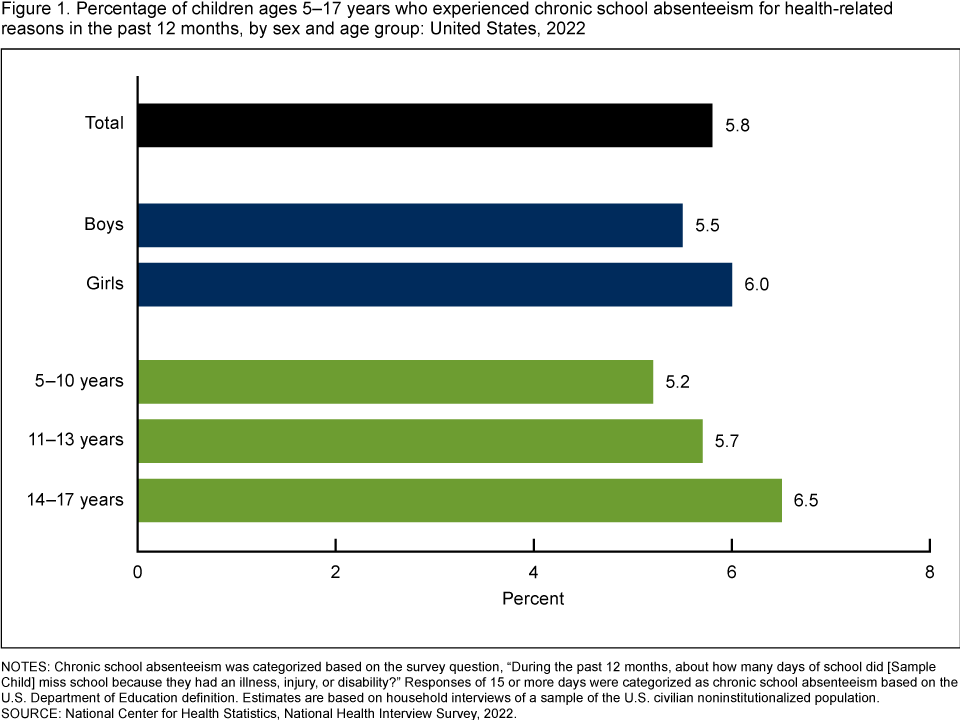 Black LI, Elgaddal N. Chronic school absenteeism for health-related reasons among children ages 5‒17 years: United States, 2022. NCHS Data Brief, no 498. Hyattsville, MD: National Center for Health Statistics. 2024. DOI: https://dx.doi.org/10.15620/cdc/147885.