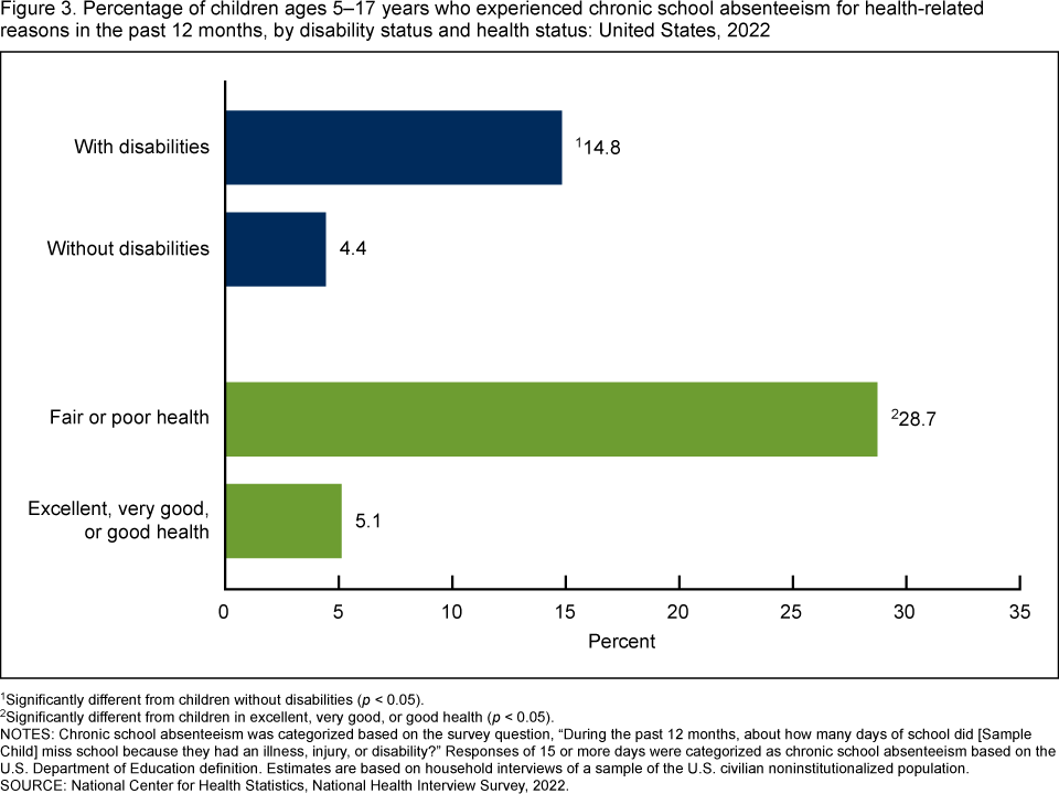 Figure 3. Percentage of children ages 5‒17 years who experienced chronic school absenteeism for health-related reasons in the past 12 months, by disability status and health status: United States, 2022