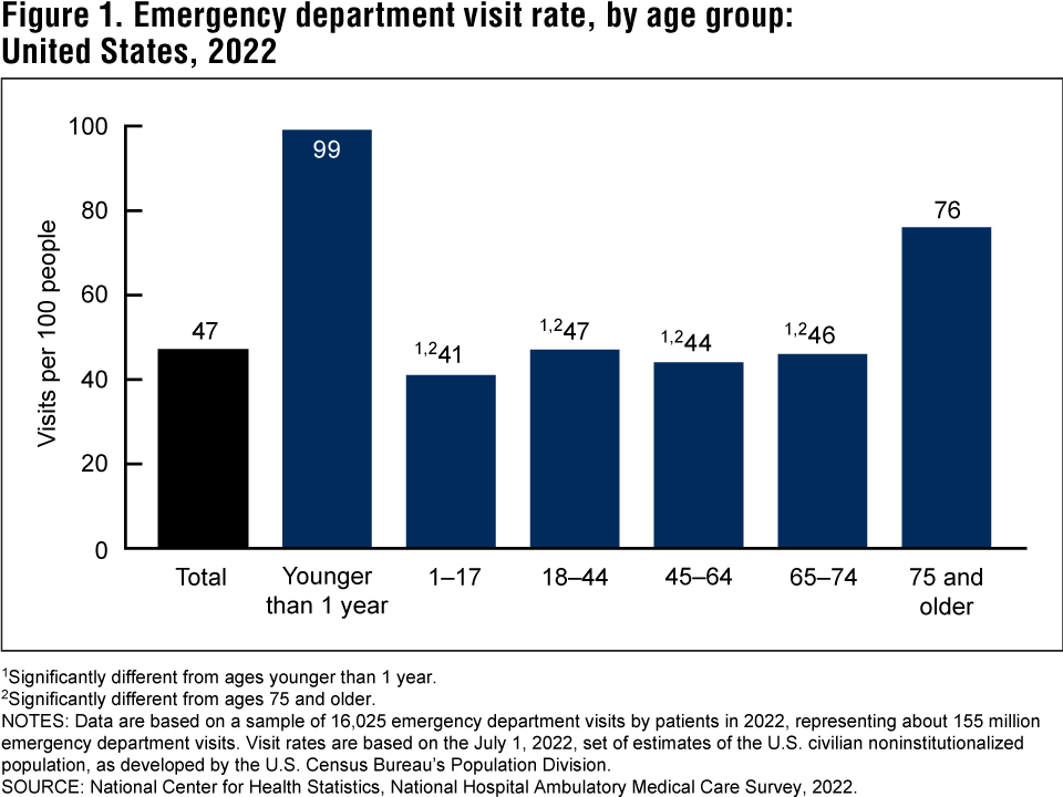 Cairns C, Ashman JJ, Kang K. Emergency department visit rates by selected characteristics: United States, 2022. NCHS Data Brief, no 503. Hyattsville, MD: National Center for Health Statistics. 2024. DOI: https://dx.doi.org/10.15620/cdc/159284.