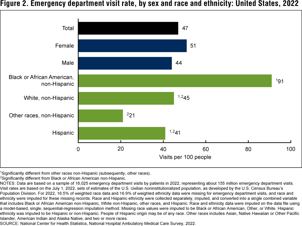- In 2022, the ED visit rate was highest for Black or African-American non-Hispanic (subsequently, Black) people (91 visits per 100 people) compared with White non-Hispanic (subsequently, White) people (45), Hispanic people (41), and people of other non-Hispanic races (subsequently, other races) (21). Rates were lowest among other races.