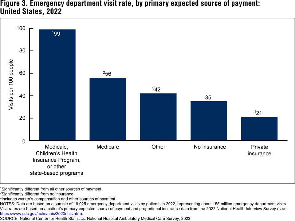 NOTES: Data are based on a sample of 16,025 emergency department visits by patients in 2022, representing about 155 million emergency department visits. Visit rates are based on a patient’s primary expected source of payment and proportional insurance data from the 2022 National Health Interview Survey (see: https://www.cdc.gov/nchs/nhis/2020nhis.htm).