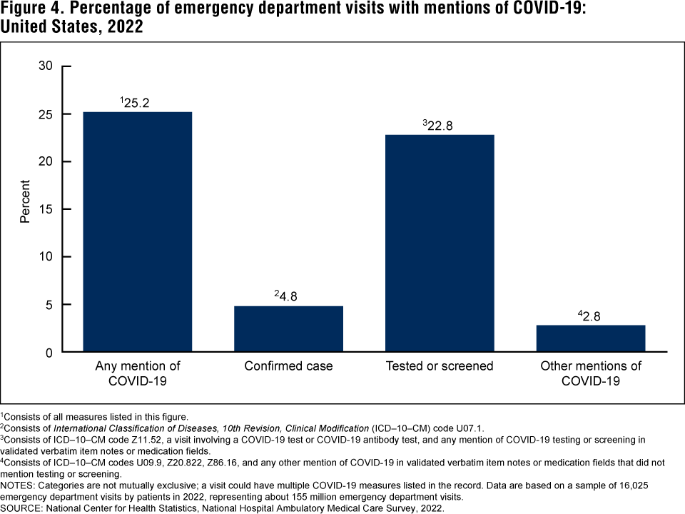- An estimated 25.2% of all ED visits in 2022 had any mention of COVID-19, which included COVID-19 testing (Figure 4, Table 4).