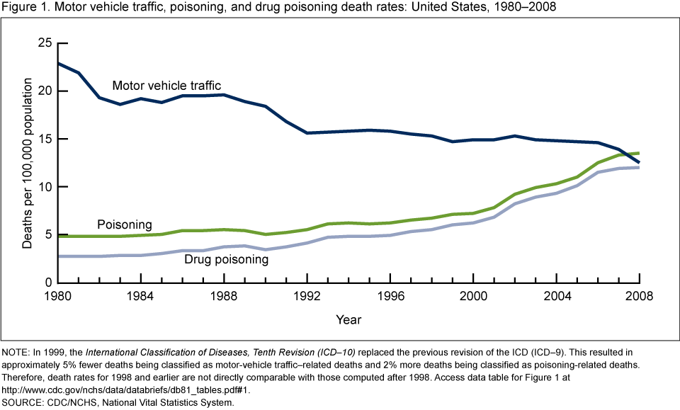 In 2008, the number of poisoning deaths exceeded the number of motor vehicle traffic deaths and was the leading cause of injury death for the first time since at least 1980. During the past three decades, the poisoning death rate nearly tripled, while the motor vehicle traffic death rate decreased by one-half. During this period, the percentage of poisoning deaths that were caused by drugs increased from about 60% to about 90%.