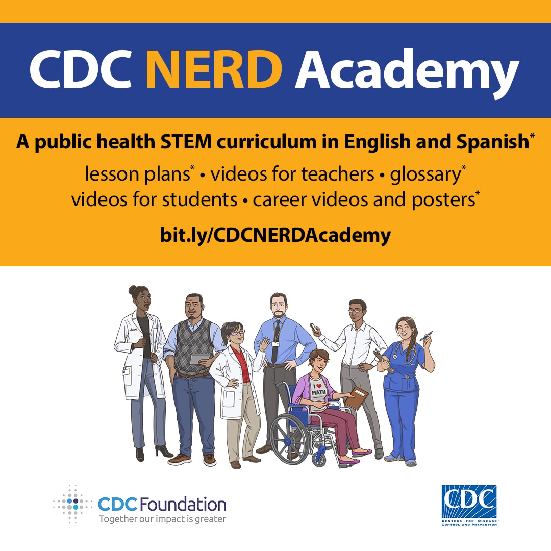 Middle and high school #STEM educators can teach #epidemiology and #PublicHealth concepts with @Centers for Disease Control and Prevention’s NERD Academy curriculum, available in English and Spanish! The 8-module series covers pandemics, disease spread, lab testing, and other topics using a mix of educational videos, critical thinking activities, and public health experts representing #STEMCareer paths. Learn more: https://bit.ly/CDCNERDAcademy #CDCSTEM