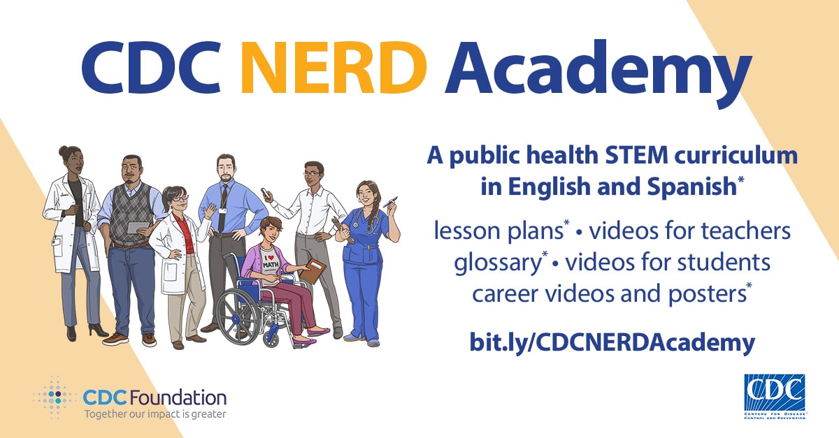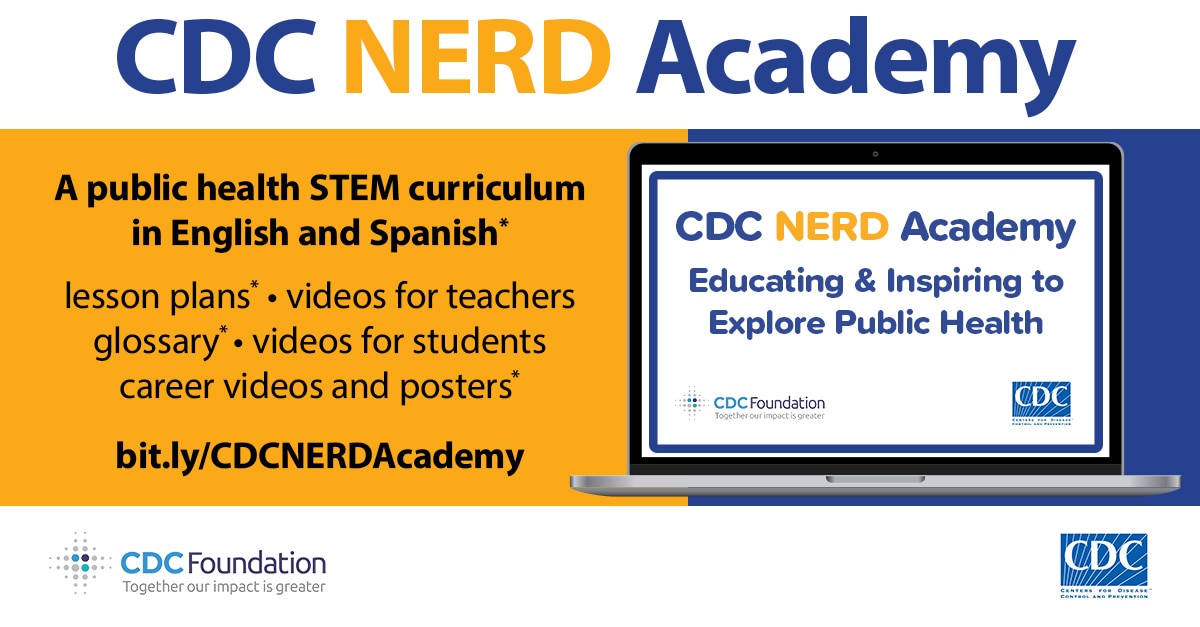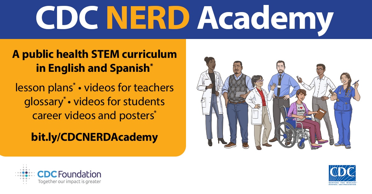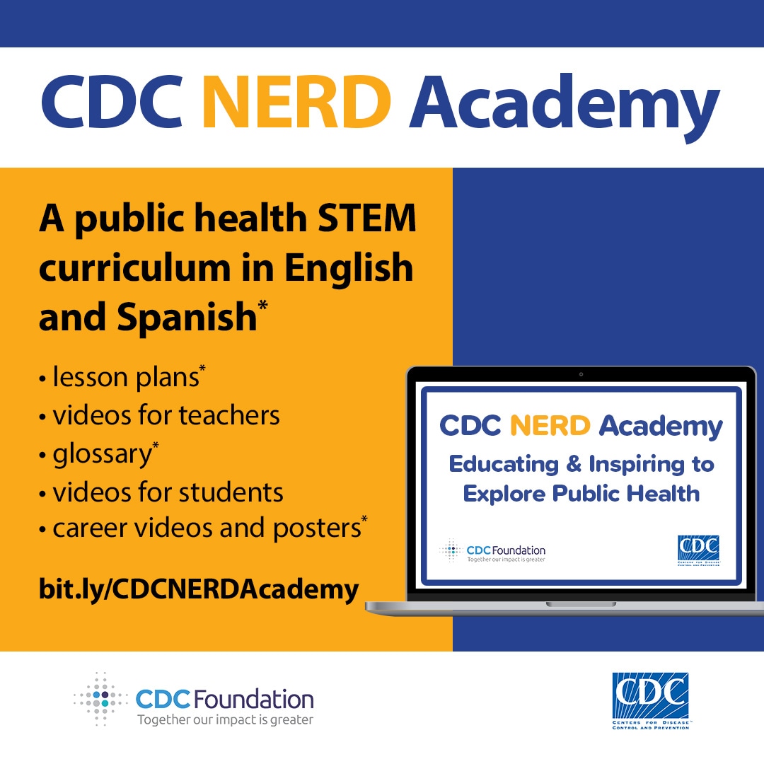 Are you a #STEM educator ready to engage students in #PublicHealth? The @Centers for Disease Control and Prevention, in collaboration with @CDC Foundation, presents the CDC NERD Academy curriculum – available in English and Spanish – for middle and high school #STEM teachers. Engage students in outbreak investigations, lab testing, data analysis, and other interactive activities while empowering them to pursue #careers in public health. #CDCSTEM Learn more: https://bit.ly/CDCNERDAcademy