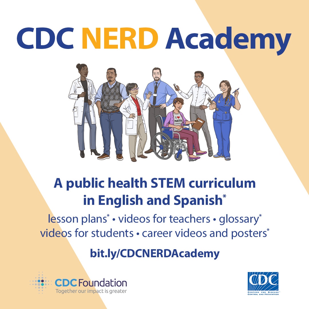 Calling all middle- and high-school STEM educators! Want to teach public health in your classroom? @CDC’s NERD Academy curriculum – available in English and Spanish – uses real-world public health examples, including videos of real CDC career experts to encourage students to see themselves in public health careers! Learn more: https://bit.ly/CDCNERDAcademy.