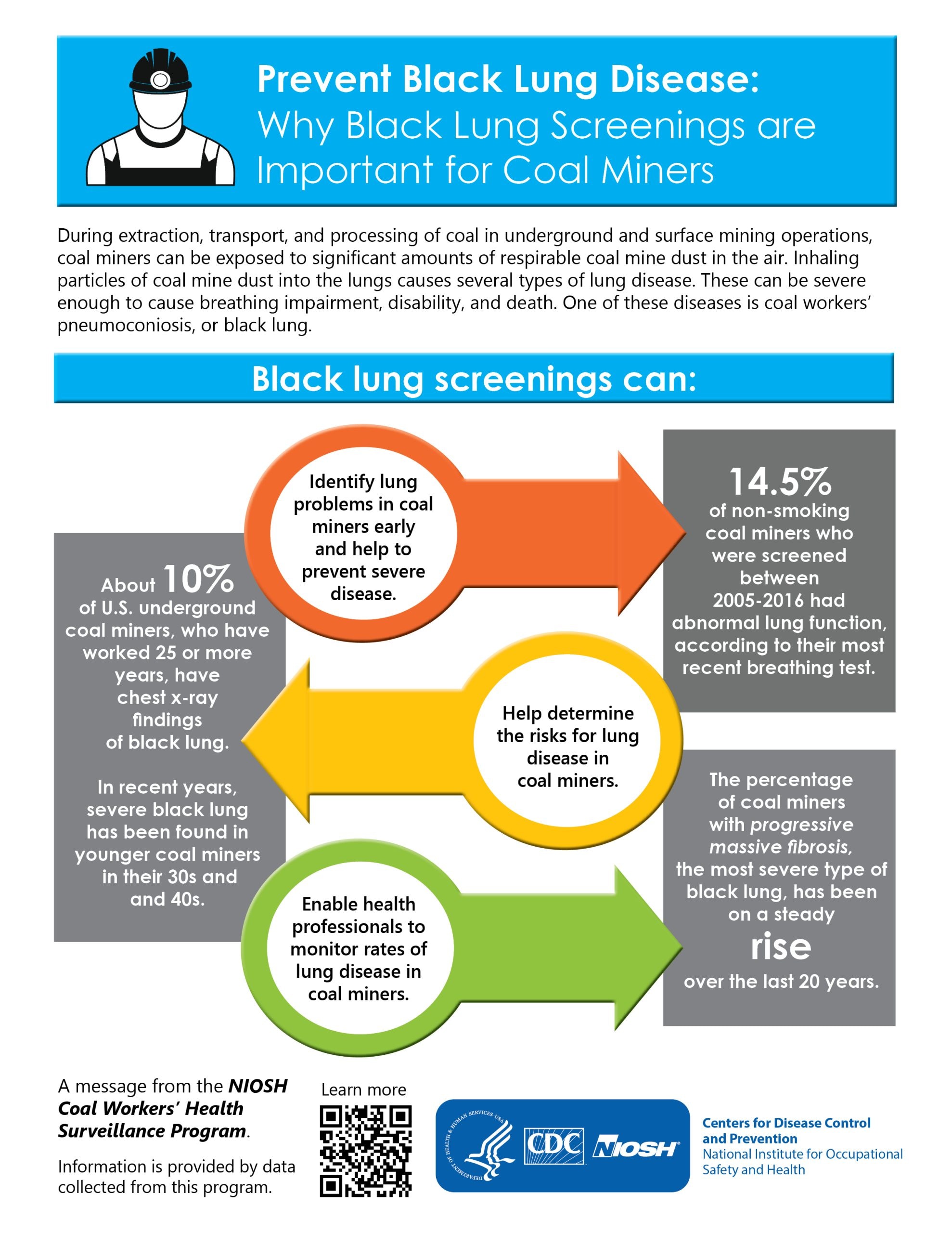 CWHSP provides U.S. coal miners with the opportunity to receive black lung screenings at no cost to miners. They are available when miners initially begin employment in coal mining and at intervals throughout their coal mining careers. For more information, go to the Black Lung Screenings page.