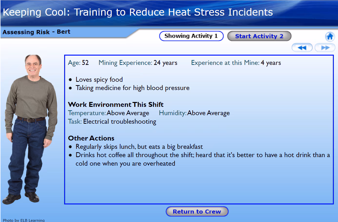The core of Keeping Cool is its first two activities, which ask trainees to assess a crew of miners. Trainees identify heat stress risks, evaluate symptoms, and recommend appropriate first aid measures.
