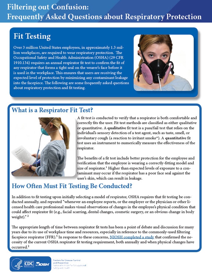 Results of a recently completed NIOSH study confirm the necessity of the current Occupational Safety and Health Administration (OSHA) respirator fit testing requirement, both annually and when physical changes have occurred.