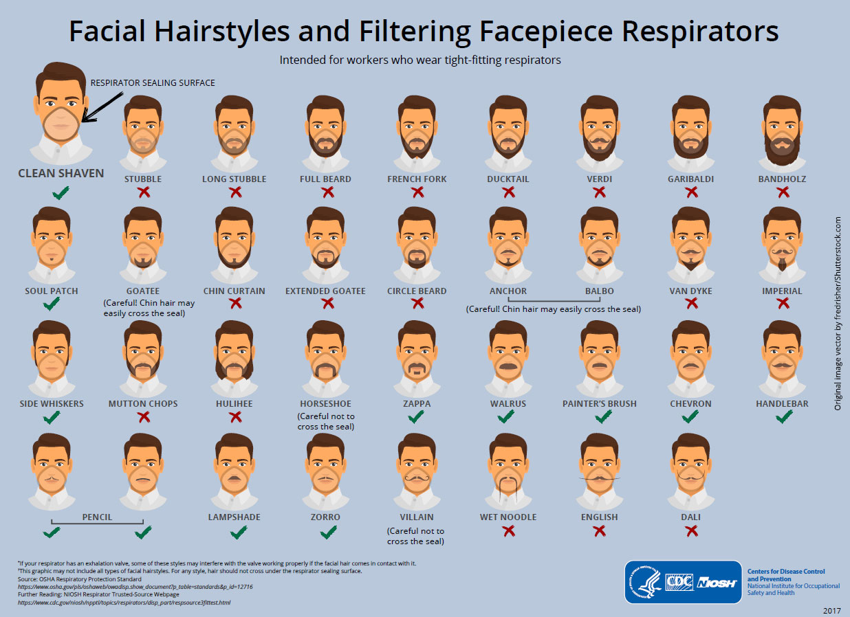 Infographic showcasing acceptable facial hairstyles for workers who wear tight-fitting respirators.