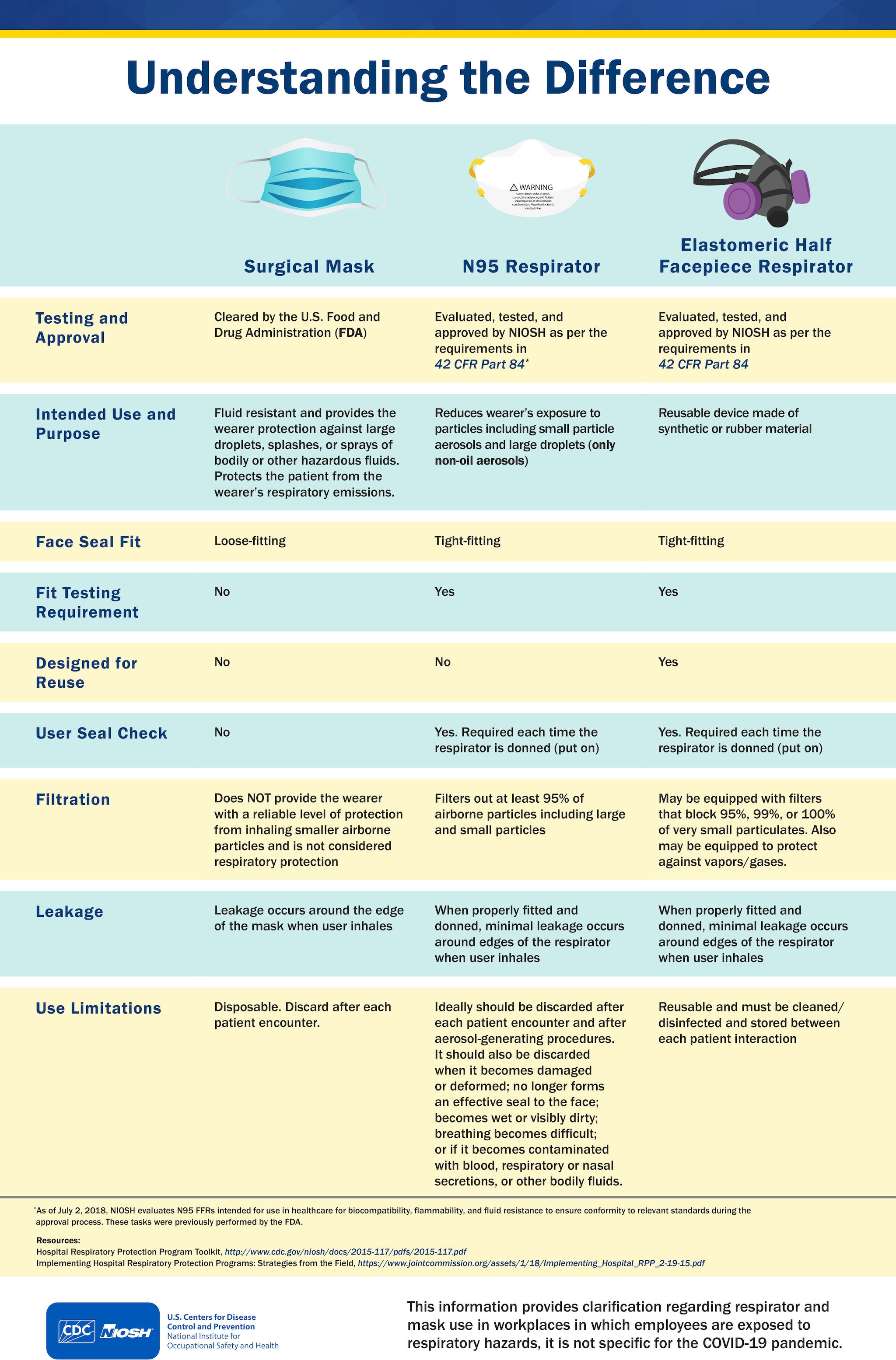 Infographic breaking down the differences between a surgical mask, N95 respirator, and elastomeric respirator.