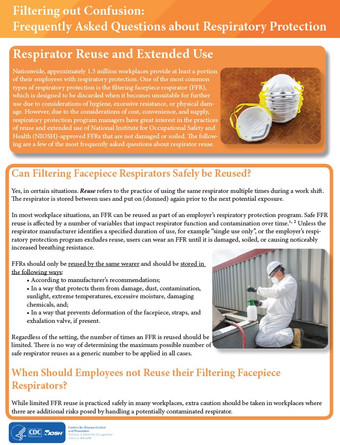 Evidence from surveillance studies indicates gaps in hospitals’ respiratory protection programmatic operations and healthcare workers’ (HCWs) marginal compliance with respiratory protection recommended practices. Improper use of respiratory protective devices (RPDs) may expose HCWs to infectious respiratory illnesses. In this document, NIOSH addresses common myths related to respiratory protection and provides information to reinforce respiratory protection program administrator responsibilities and HCW knowledge concerning the proper use of these devices so that they can be prepared for the next public health emergency and best protect themselves in daily practice.