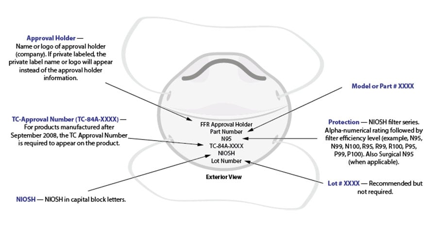 - Name of approval holder/manufacturer business name, a registered trademark, or an easily understood abbreviation of the applicant/approval holder’s business name as recognized by NIOSH. When applicable, the name of the entity to which the FFR has been private labeled by the approval holder may replace the approval holder business name, registered trademark, or abbreviation of the approval holder business name as recognized by NIOSH.