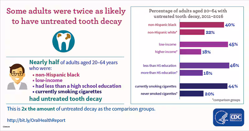 Nearly half of adults aged 20–64 years who were: non-Hispanic black, low-income, had less than a high school education, or currently smoking cigarettes had untreated tooth decay.