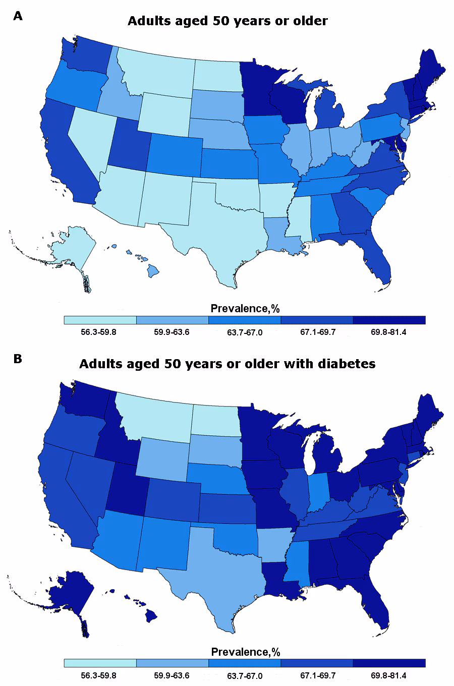 Figure. Prevalence of up-to-date colorectal cancer screening among A) adults aged 50 years or older and B) adults aged 50 years or older with diabetes, Behavioral Risk Factor Surveillance System (BRFSS), 2012. [A tabular version of this figure is also available.]
