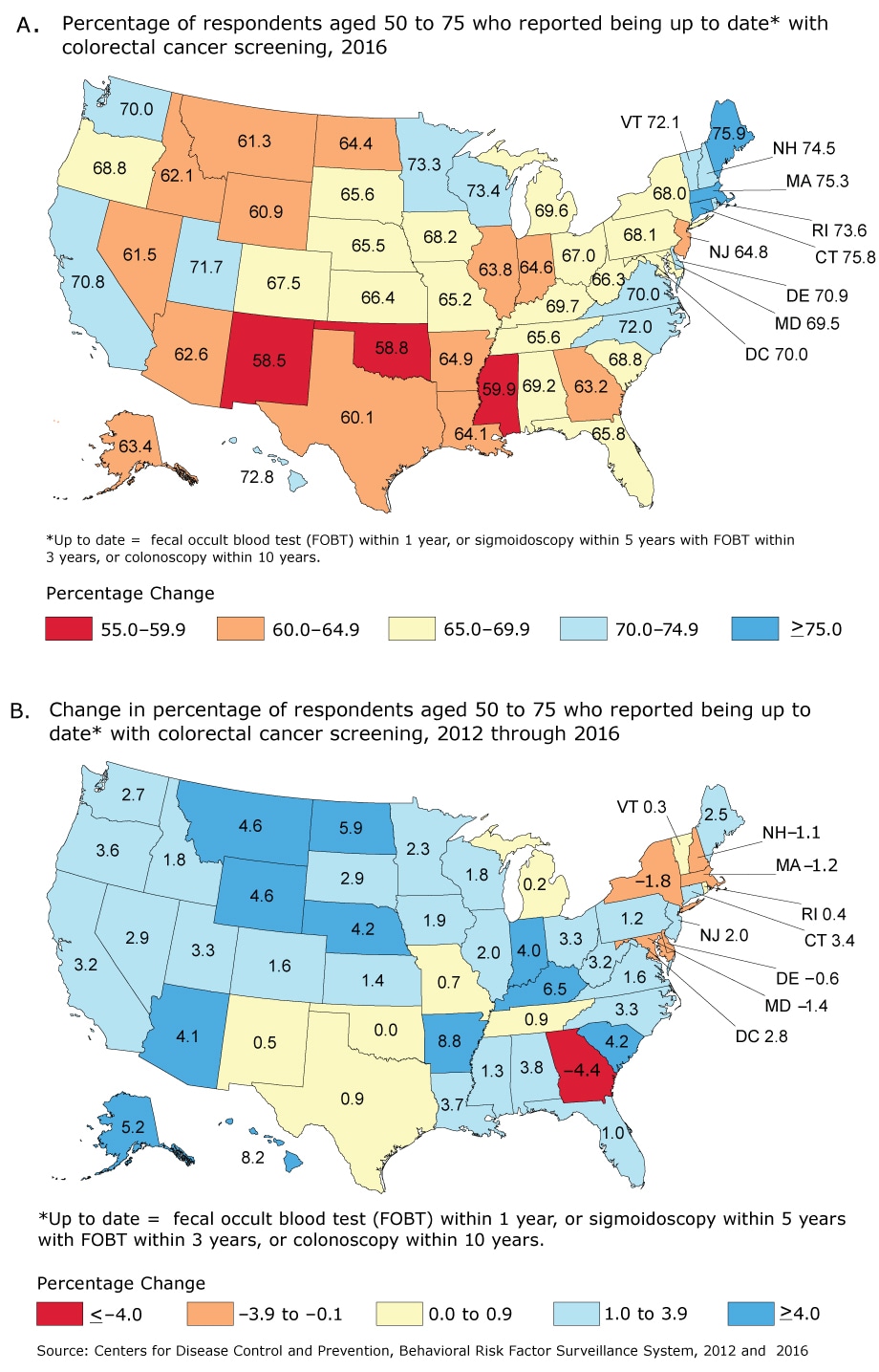Colorectal cancer (CRC) is the second most common cause of cancer death among cancers that affect both men and women (3). There is strong evidence that screening reduces CRC incidence and deaths from the disease (4). The 2008 US Preventive Services Task Force (USPSTF) recommendations include several test options for screening for CRC among adults aged 50 to 75: 1) annual high-sensitivity fecal occult blood test (FOBT), 2) colonoscopy every 10 years, or 3) sigmoidoscopy every 5 years with FOBT every 3 years (4). Despite strong evidence for its use, an estimated 23 million age-eligible adults were not tested for CRC in 2012 (5). This article describes the estimated percentage of adults aged 50 to 75 (eligible adults) who reported being up to date with CRC screening in 2016, and the change in the percentage from 2012 through 2016, by state.