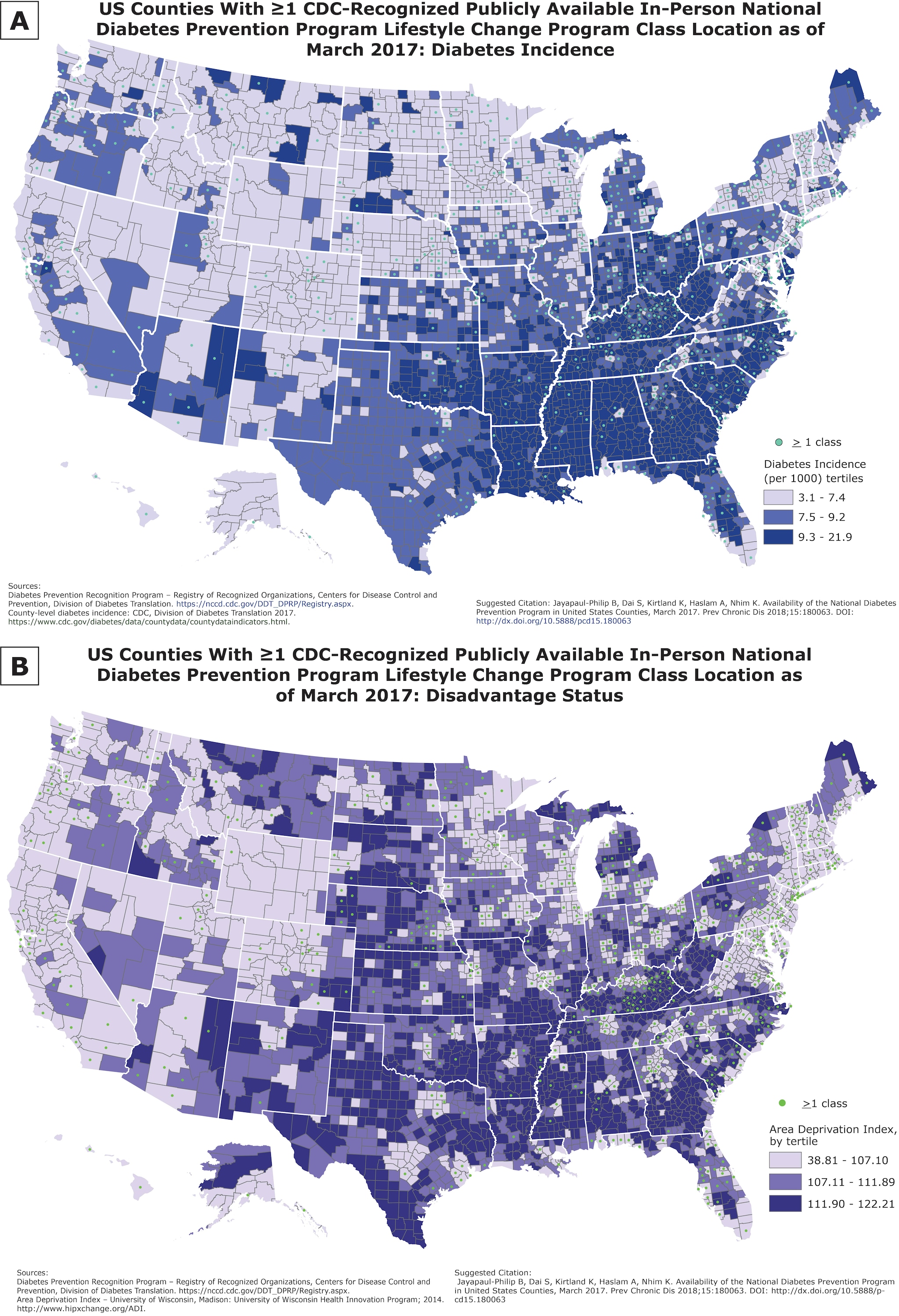 Map A shows U.S. counties with one or more CDC-recognized publicly available in-person National Diabetes Prevention Program Lifestyle Change Program Class locations as of March 2017, by diabetes incidence status. The map shows more clustering of Lifestyle Change Programs in counties with low diabetes incidence, and less clustering in counties with high diabetes incidence. More counties in the lowest tertile of diabetes incidence (26.8%26#37;) had an in-person Lifestyle Change Program class location, whereas fewer counties in the middle and high diabetes incidence tertiles (23.7%26#37; and 17.4%26#37;, respectively) had a class location. Map B shows U.S. counties with 1 or more CDC-recognized publicly available in-person National Diabetes Prevention Program Lifestyle Change Program Class locations as of March 2017, by socioeconomic disadvantage status. The map shows more clustering of Lifestyle Change Programs in counties with low socioeconomic disadvantage and less clustering in counties with high socioeconomic disadvantage. More counties (39%26#37;) in the lowest Area Deprivation Index tertile had a Lifestyle Change Program class location than did counties in the middle and highest Area Deprivation Index tertiles (19.3%26#37; and 9.7%26#37;, respectively). Counties with the middle and highest Area Deprivation Index tertiles have the greatest economic need.