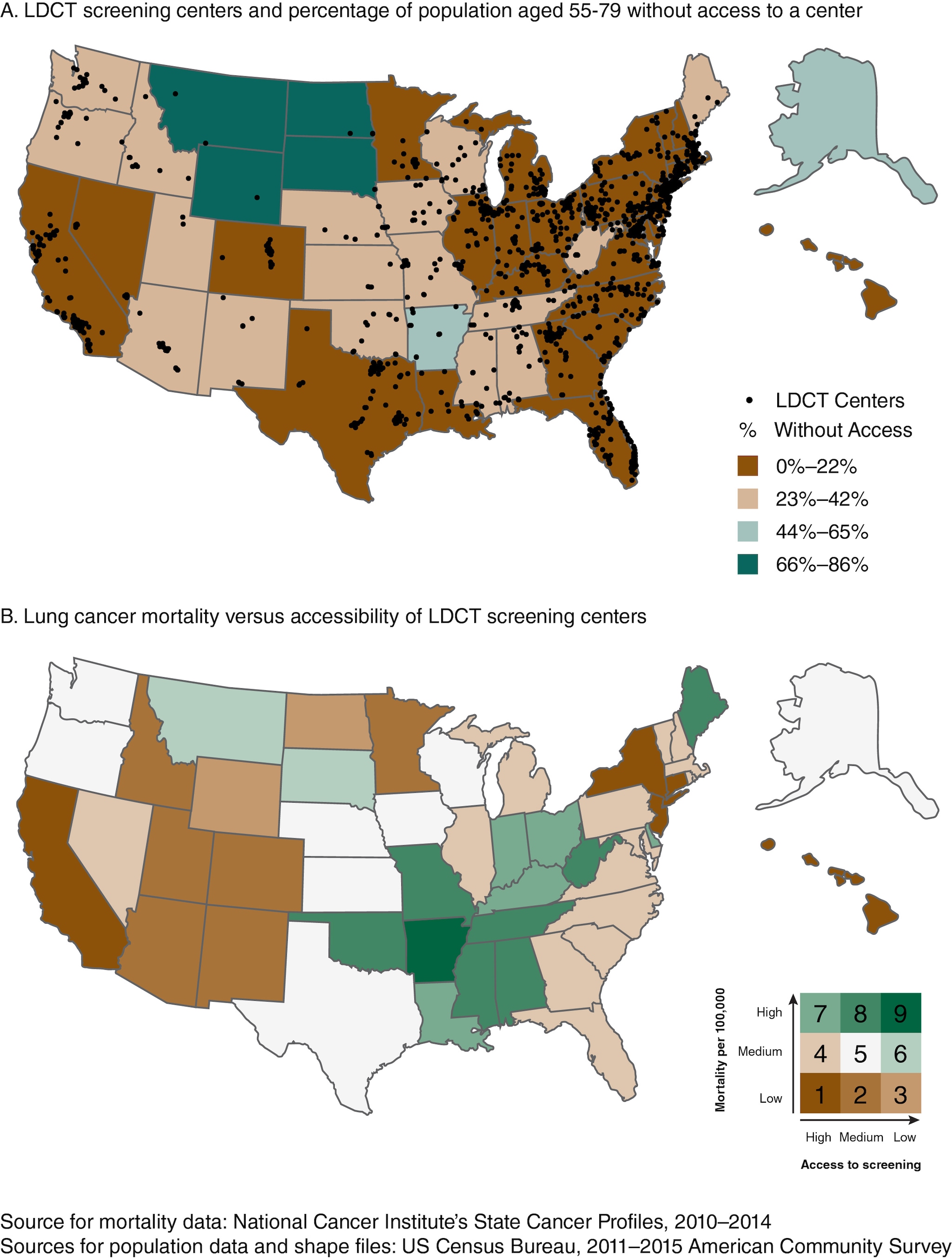 Lung cancer mortality was highest in the eastern interior of the United States. A cluster of high mortality stretches north to south from West Virginia to Louisiana and west to east from Oklahoma to West Virginia. Despite their high rate of lung cancer mortality, Alabama, Arkansas, Mississippi, Oklahoma, Tennessee, and West Virginia had low to medium levels of access to LDCT screening. All the states along the eastern seaboard and in the Northeast, except Maine, had high access to LDCT screening (Panel B).