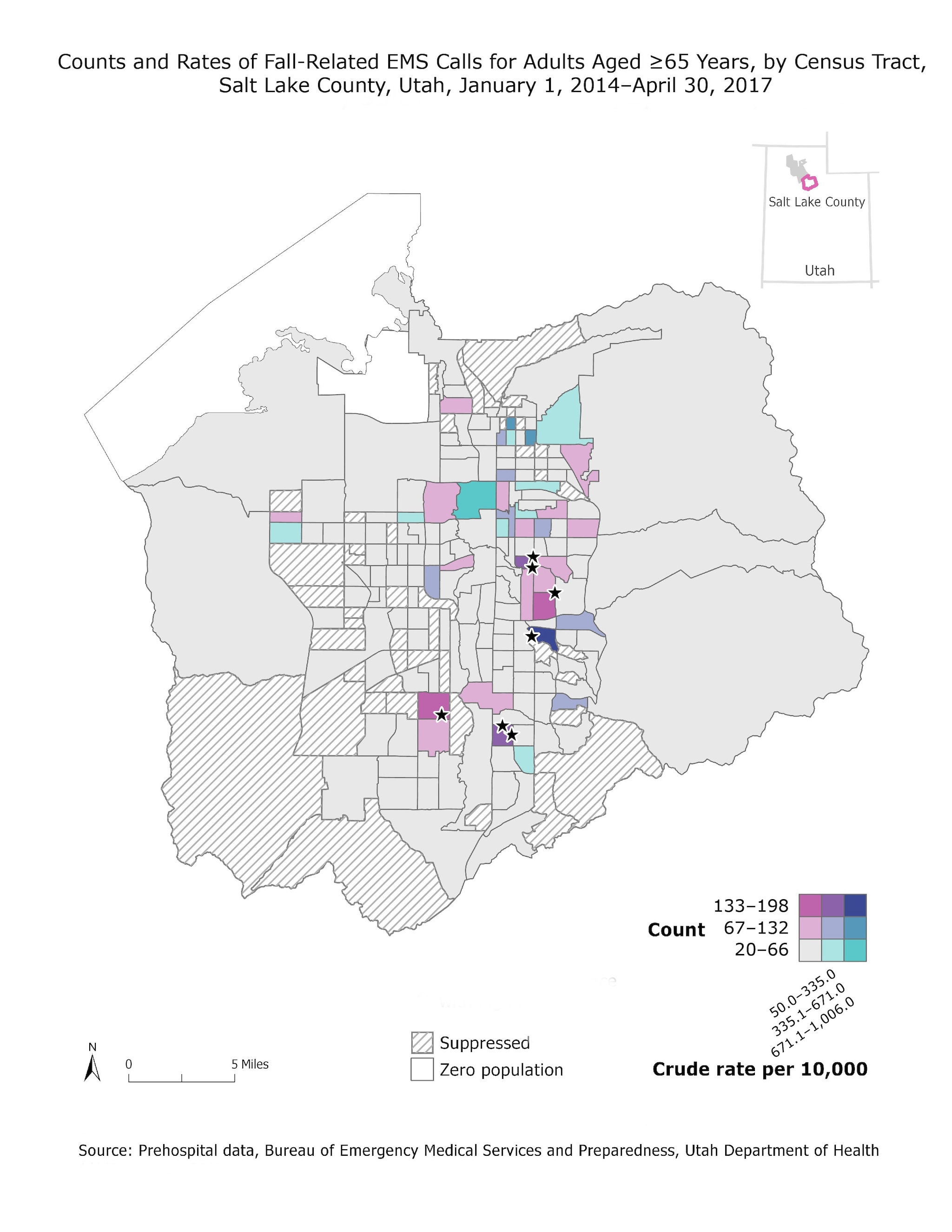 The map displays counts and rates, by census tract, of fall-related EMS calls among adults aged 65 or older in Salt Lake County, Utah, from January 1, 2014, through April 30, 2017. Stars indicate senior living residences with high fall burden. Data were suppressed in areas that had fewer than 20 falls or the relative standard error of the crude rate of fall-related EMS calls was higher than 30%. Abbreviation: EMS, emergency medical services. [A text description of this figure is available.]