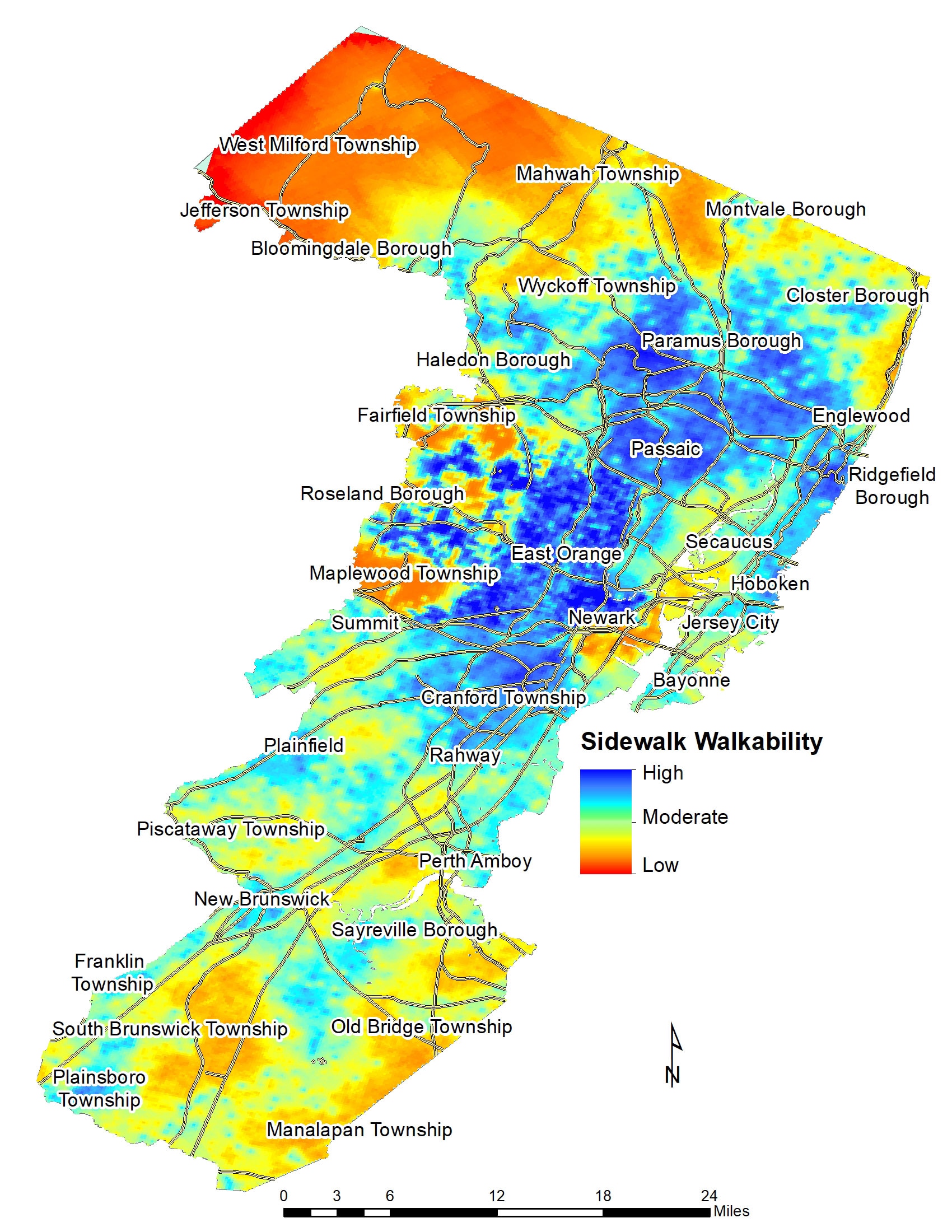 High levels of sidewalk walkability are concentrated in the urban core of northeastern New Jersey, in areas such as East Orange, Newark, and Passaic. As distance increases from the urban core, the level of walkability tends to decrease. For example, in the far northwestern corner of the map, in West Milford Township, the level of sidewalk walkability is lowest. In the southern portion of the map, towards Manalapan Township, the levels of walkability are moderate to fair. However, small-scale variation exists throughout the study region.