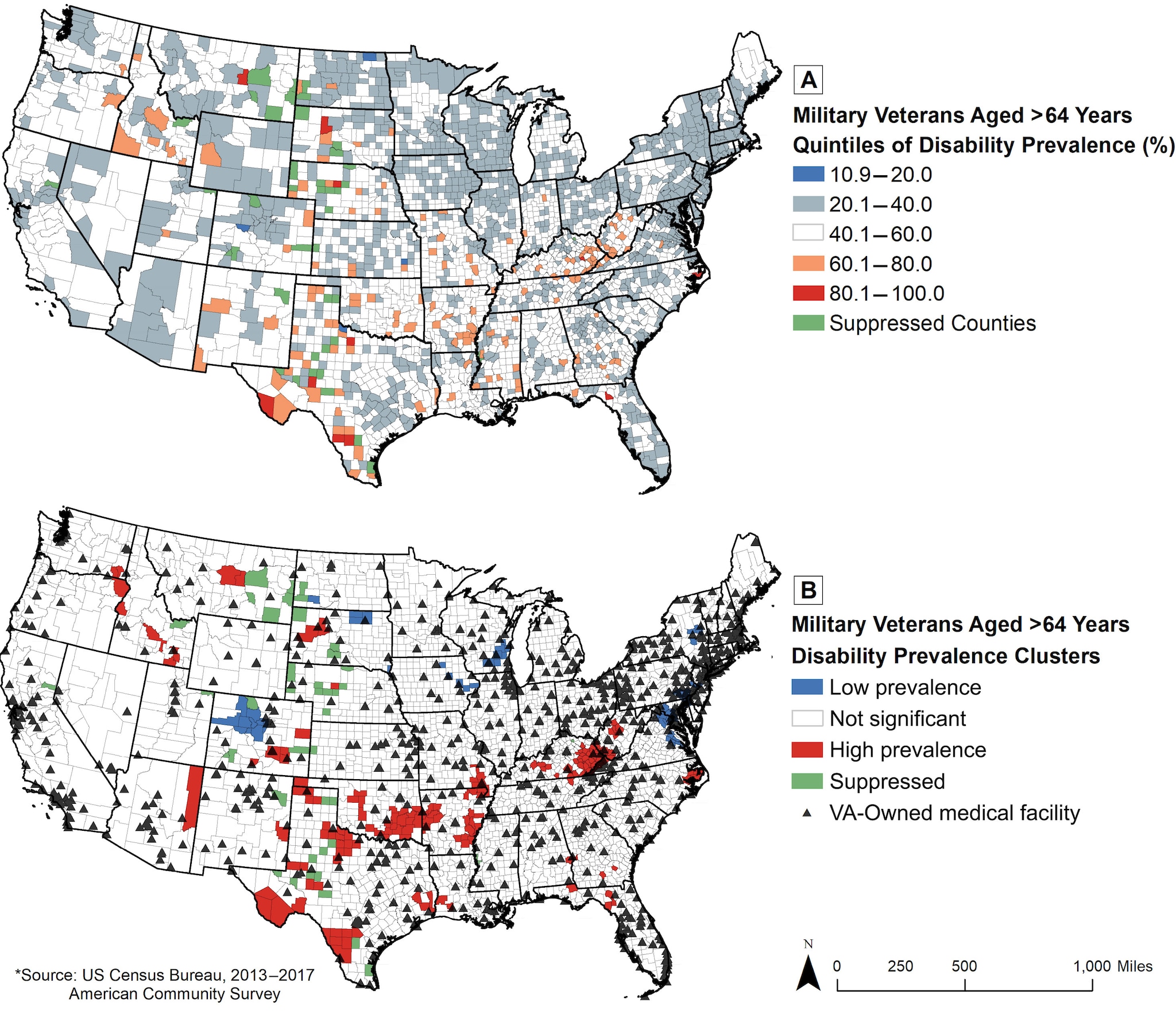 The national disability prevalence rate for older veterans in the United States from 2013–2017 was 40.0% (99% CI, 40.0%–40.1%). Portions of 28 contiguous states (ie, Alabama, Arkansas, Colorado, Florida, Georgia, Idaho, Illinois, Indiana, Kansas, Kentucky, Louisiana, Mississippi, Missouri, Montana, Nebraska, New Mexico, North Carolina, North Dakota, Oklahoma, Oregon, South Dakota, Tennessee, Texas, Utah, Virginia, Washington, West Virginia, and Wyoming) contained counties with a disability prevalence of 60% or more; 41,476 older veterans resided in these 160 counties, representing 1.2% of all disabled older veterans. Twenty-two (13.3%) of the 165 counties with clusters of high disability prevalence contained a VA-owned medical facility; 18 (35.3%) of the 51 counties with clusters of low disability prevalence contained a VA-owned medical facility.