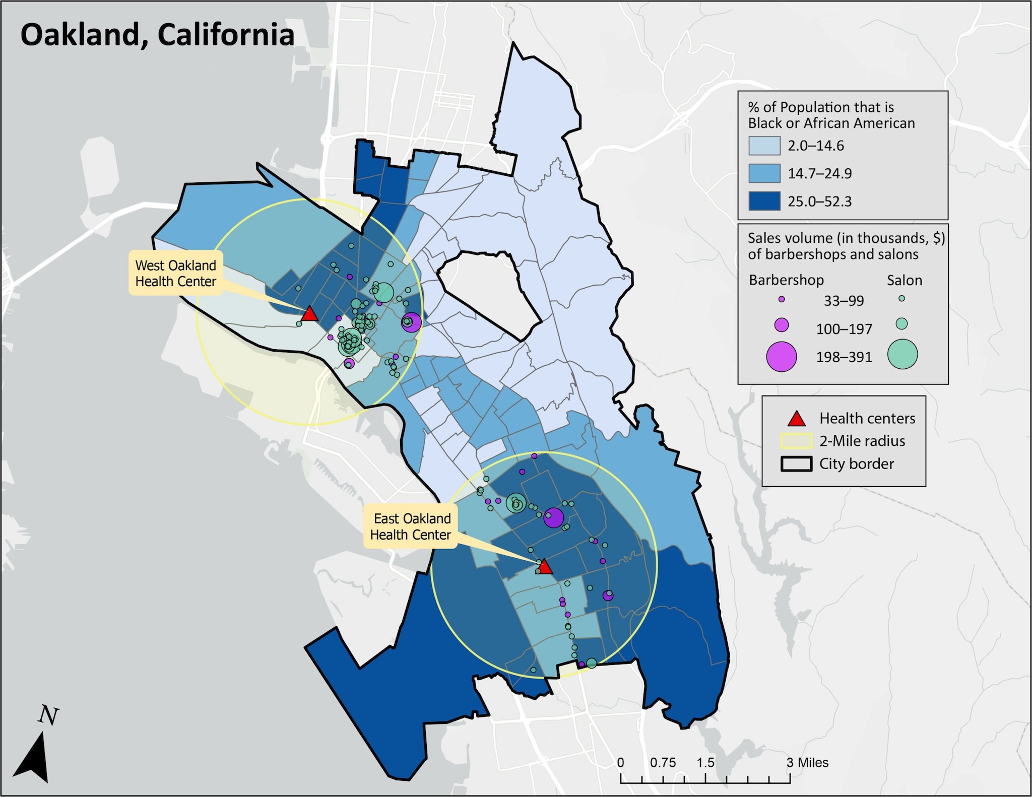 We obtained data on the percentage of the population that is African American in each census tract in Oakland, California, from the US Census Bureau American Community Survey (2016–2020) (1). We selected the East Oakland Health Center and the West Oakland Health Center because of their interest in partnering in Million Hearts. We used the North American Industry Classification System codes 812111 (barber shops) and 812112 (hair salons) from Esri Business Analyst to obtain geocoded data on barbershops and hair salons, along with their sales volumes (2). We categorized barbershops and hair salons according to tertiles of sales volume.