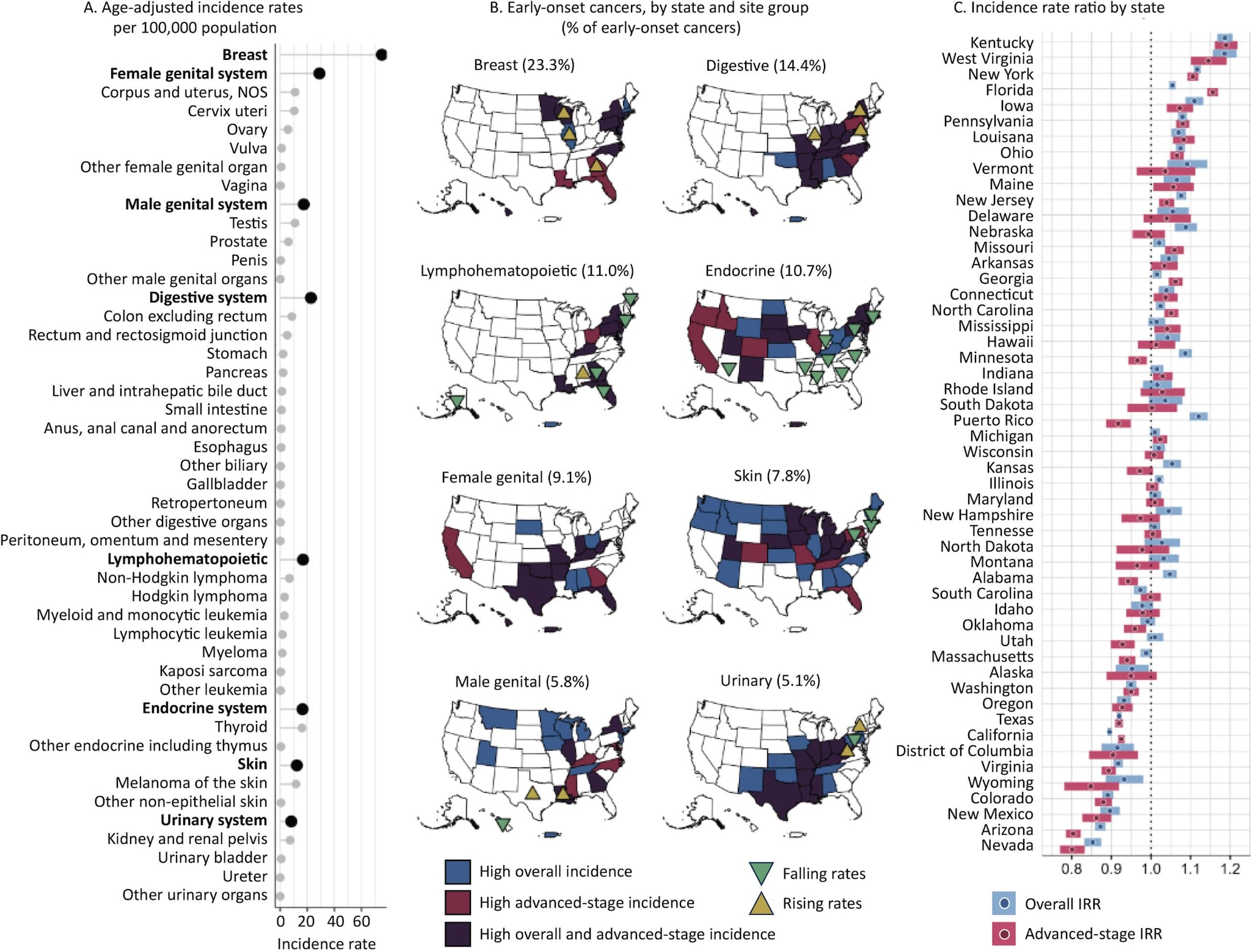 Our maps of high overall incidence and high advanced-stage incidence indicate that the incidence of early-onset cancer is not evenly distributed (Panel B). States that have worse-than-national rates are frequently near each other geographically. States with changing rates only sometimes have the highest incidence.