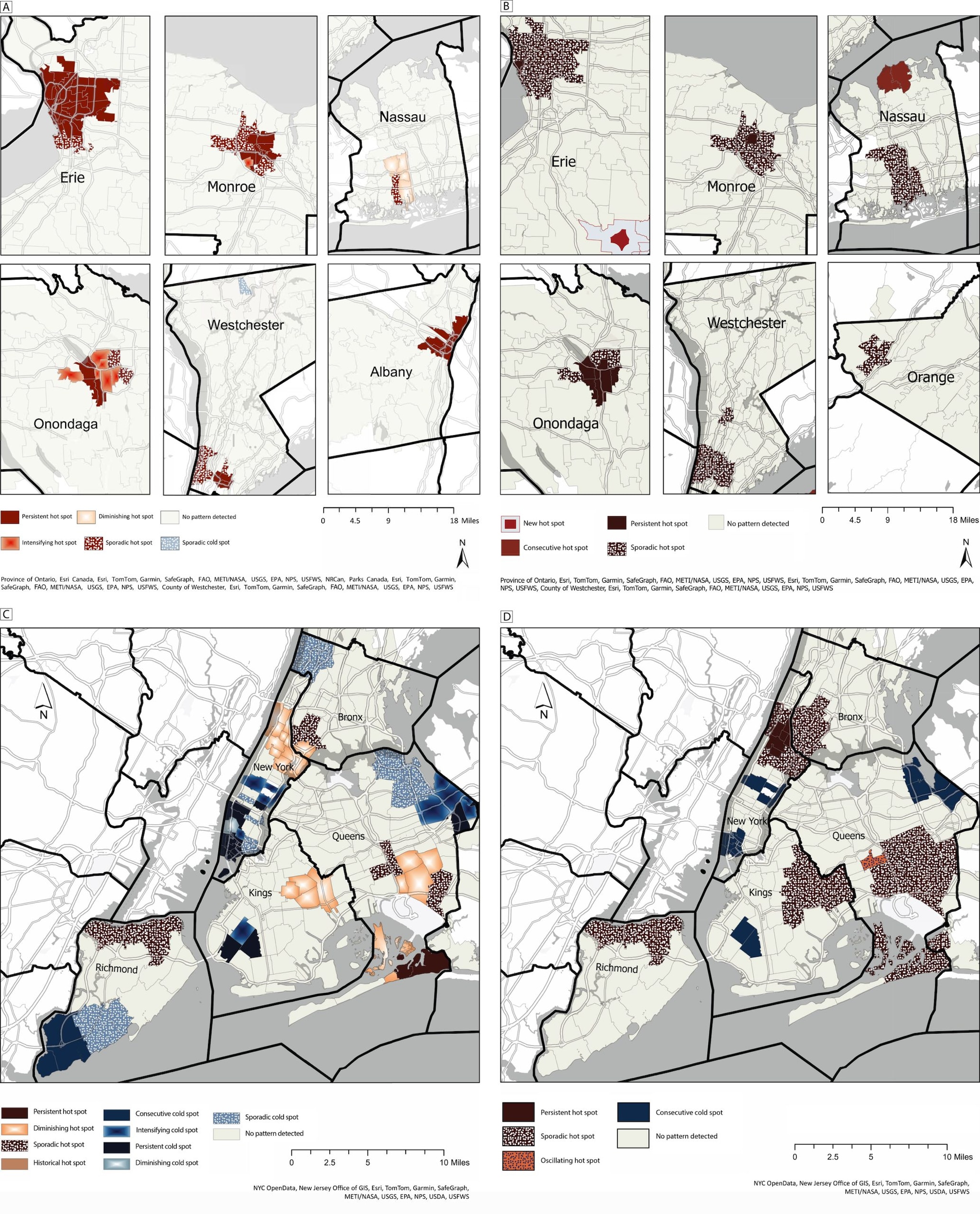 New York City (NYC) showed more hot spots and fewer cold spots during the prepandemic (Figure, Panel C) compared with the pandemic period (Figure, Panel D). The cold spot reduction was observed in northeastern Queens and southern Richmond counties, and an increasing number of hot spots were observed in New York, Bronx, Kings, and Queens counties. In upper New York County, zip codes 10026, 10027, 10030, 10031, 10037, and 10039 were diminishing hotspots prepandemic and became persistent hotspots during the pandemic.