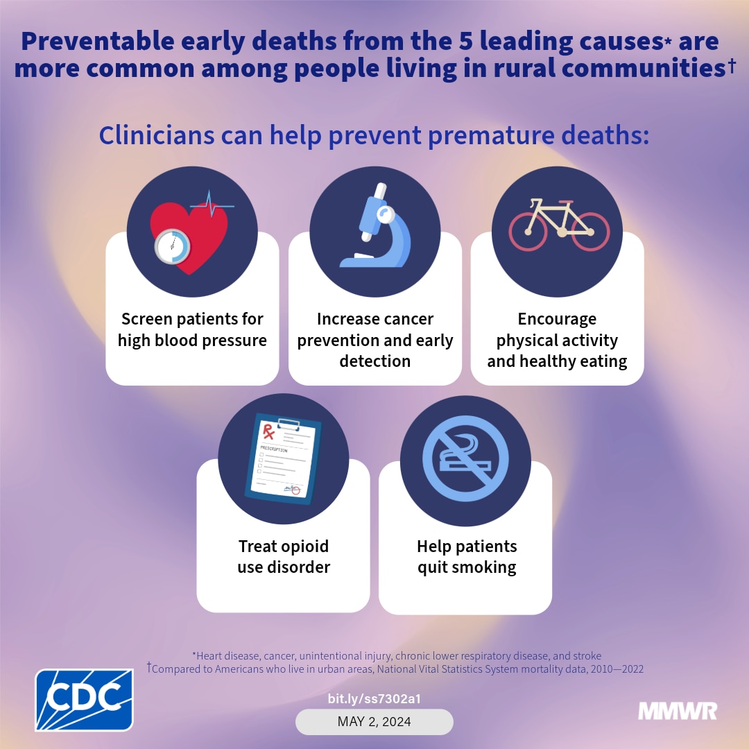 HCPs: How can you help patients in rural communities live longer, healthier lives? Learn more about the leading causes of death and strategies you can promote to reduce risk. bit.ly/3w6MUKt #MMWR #ruralhealth #ruralpublichealth