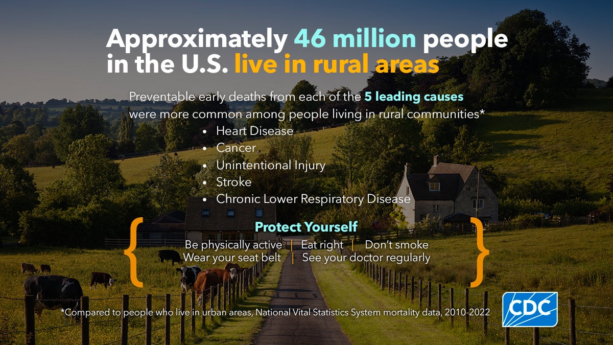 CDC data show that dying early from the five leading causes of death is more common among people living in rural areas compared to those living in urban areas. Public health practitioners and partners can use this toolkit to share findings with your colleagues and in your communities.