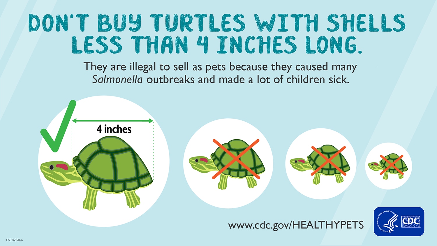 A federal law bans the sale and distribution of turtles with shells less than 4 inches long as pets because they have caused many illnesses, especially in young children. Despite the ban, these turtles are sometimes still sold illegally online, at stores, flea markets, and roadside stands.
