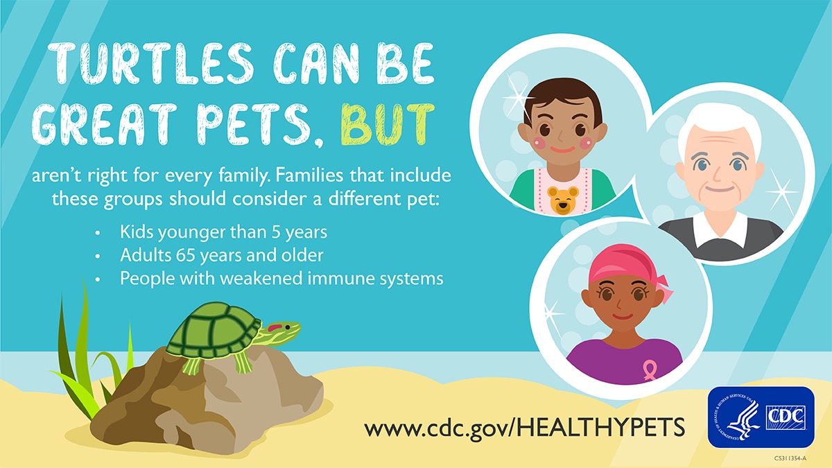 - Pet turtles are not recommended for children younger than 5, adults aged 65 and older, or people with weakened immune systems. These people are more likely to get a serious illness from germs that turtles can carry.