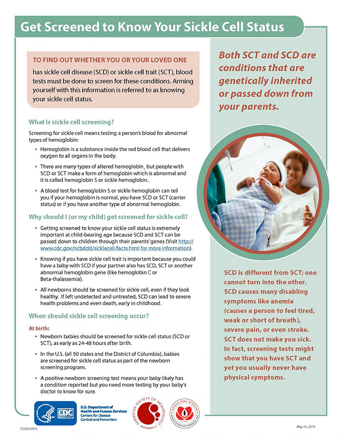 This fact sheet contains important information about sickle cell disease screening. It includes information about why it's important to get screened as well as how, when, and where to get screened.