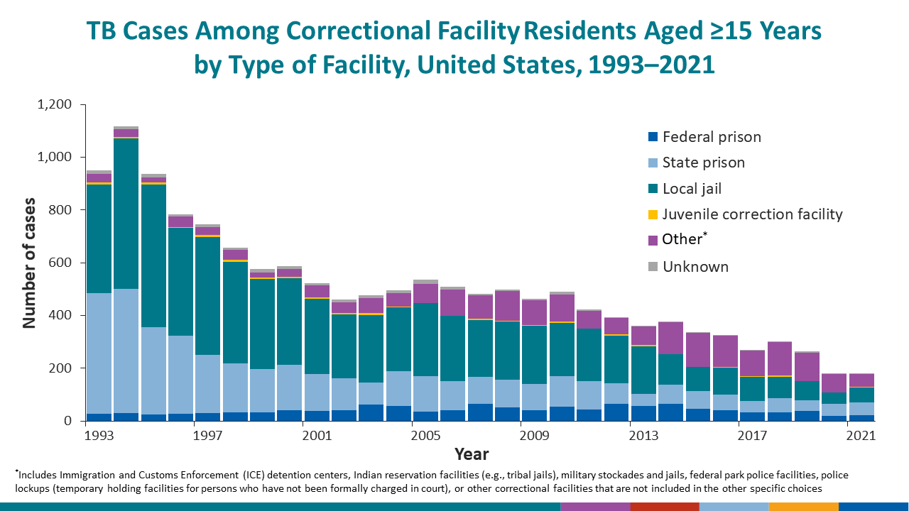 En el 2021, 179 (2.3 %) de los casos de enfermedad de TB notificados en los Estados Unidos ocurrieron en personas de 15 años de edad o mayores que en ese momento residían en un establecimiento penitenciario.