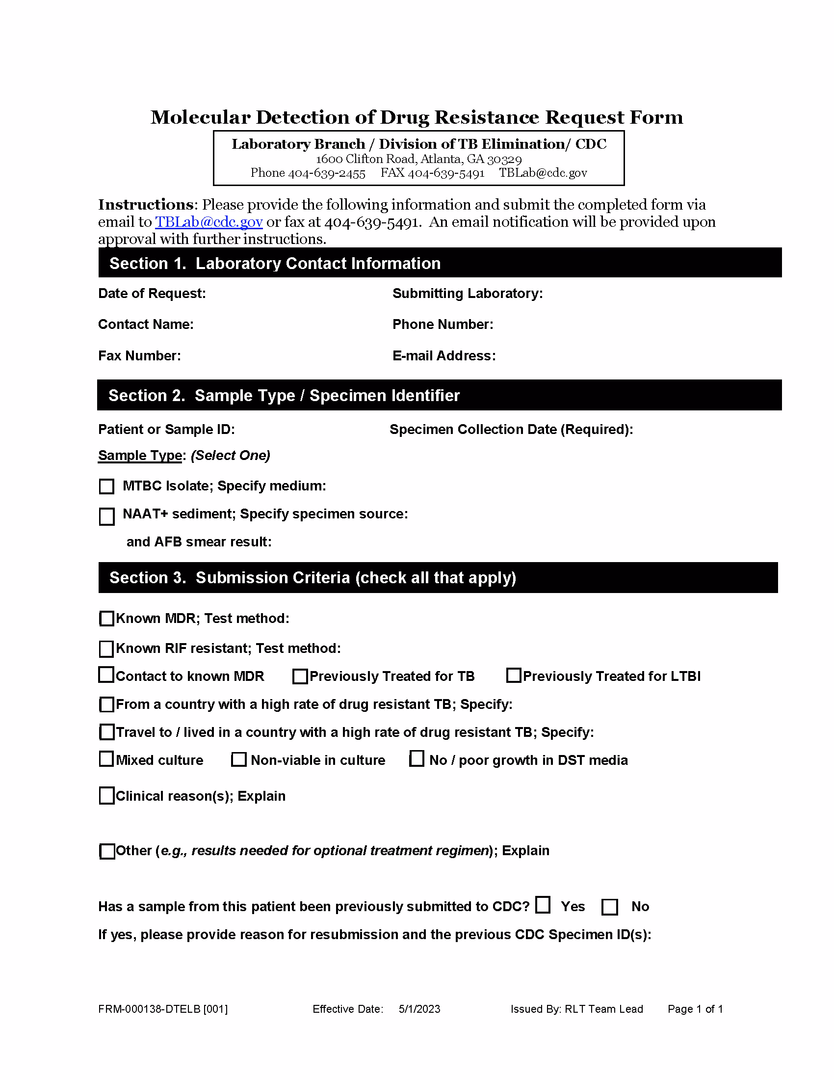 For more information, please refer to the Laboratory User Guide for U.S. Public Health Laboratories: Molecular Detection of Drug Resistance (MDDR) in Mycobacterium tuberculosis Complex by DNA Sequencing.