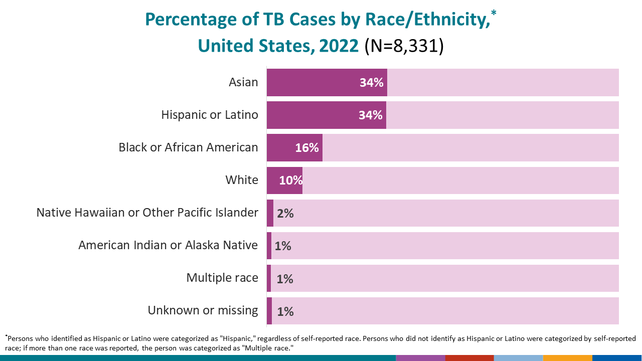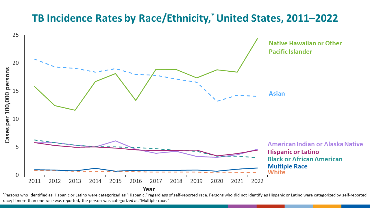 During 2022, TB incidence rates (cases per 100,000 persons) varied by race/ethnicity groups: