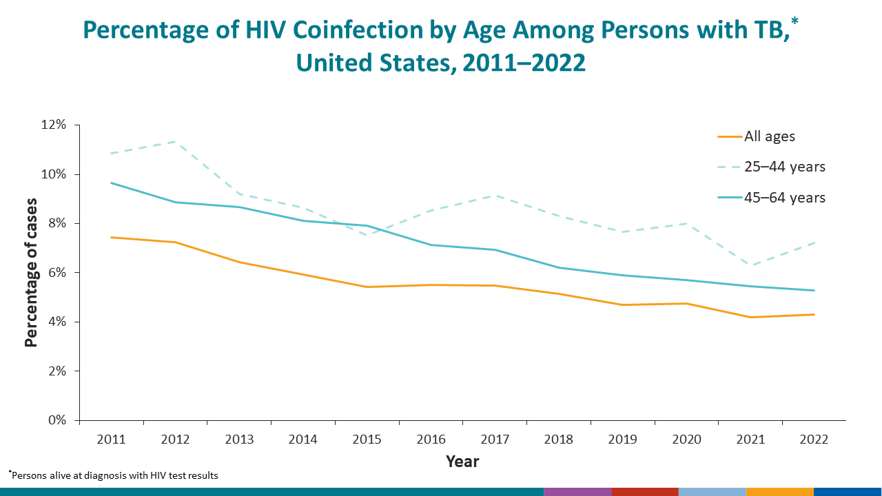 Table 17. Tuberculosis Cases and Percentages Among Persons with HIV Test Results1 and with HIV Coinfection by Age Group:2 United States, 2011–2022